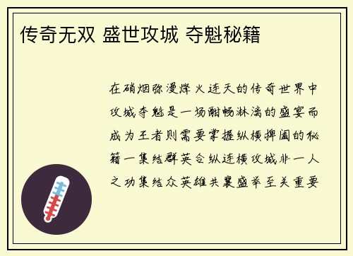 在硝烟弥漫、烽火连天的传奇世界中,攻城夺魁是一场酣畅淋漓的盛宴,而成为王者,则需要掌握纵横捭阖的秘籍。