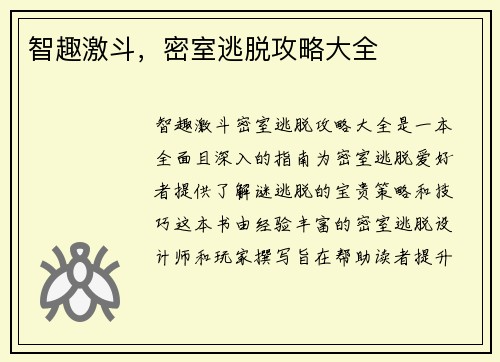 《智趣激斗,密室逃脱攻略大全》是一本全面且深入的指南,为密室逃脱爱好者提供了解谜、逃脱的宝贵策略和技巧。这本书由经验丰富的密室逃脱设计师和玩家撰写,旨在帮助读者提升技能,体验成功的喜悦。