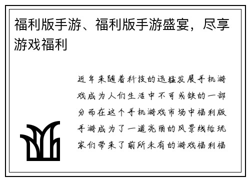 福利版手游、福利版手游盛宴,尽享游戏福利